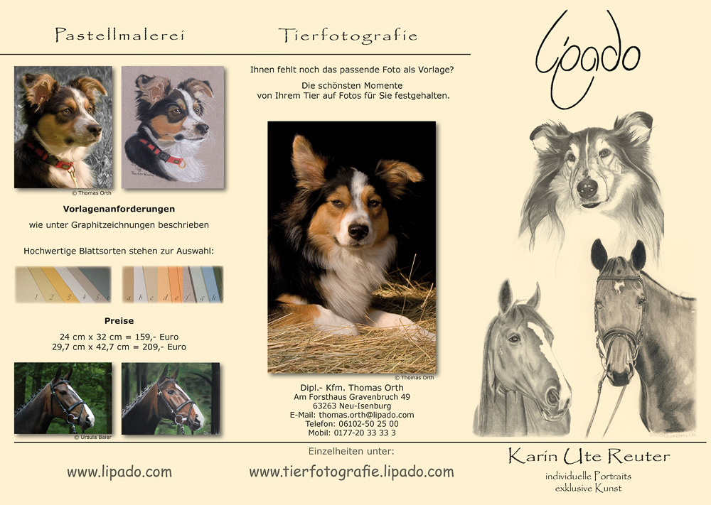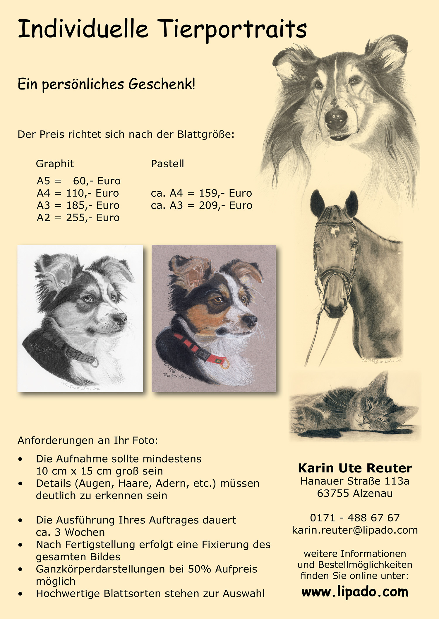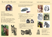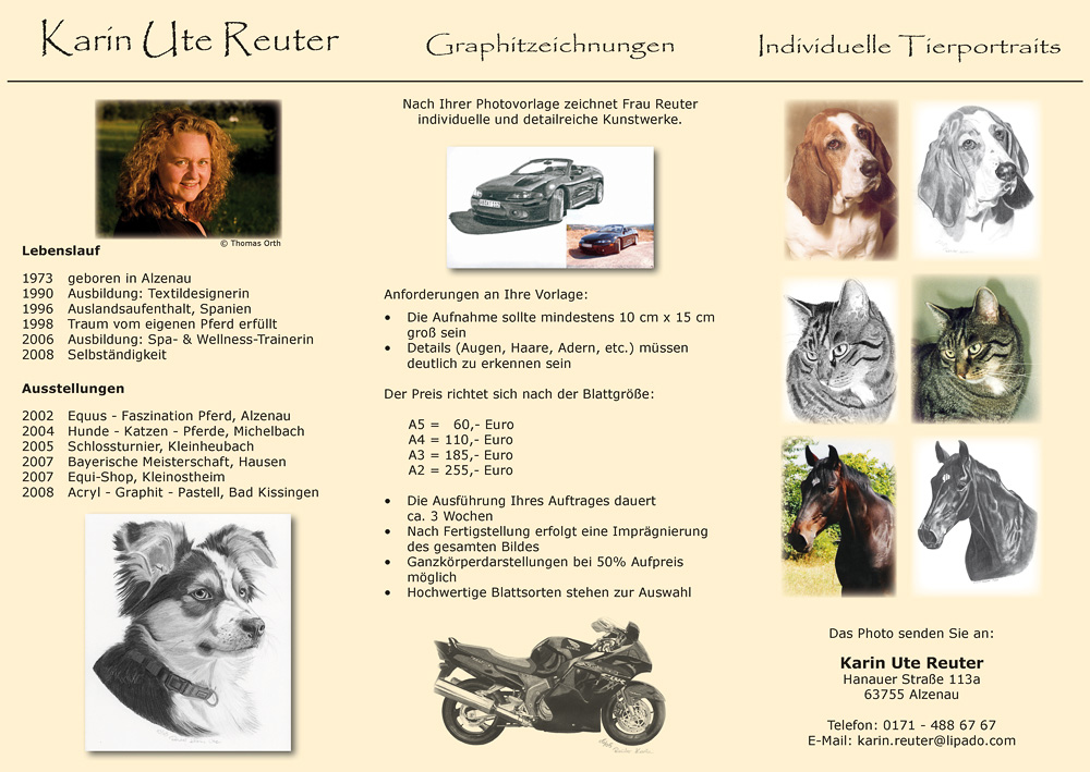 Ausstellungen 2002 "Equus - Faszination Pferd", Alzenau 2004 "Hunde - Katzen - Pferde", Michelbach 2005 Schlossturnier, Kleinheubach 2007 Bayerische Meisterschaft, Hausen 2007 Equi-Shop, Kleinostheim 2008 Bayerische Meisterschaft, Hausen 2008 Acryl - Graphit - Pastell, Bad Kissingen 2008/2009 Graphitzeichnungen und Tierfotografie, 23.05. - 24.05.09 EZFG e.V. Elotreffen, 63849 Leidersbach, Stadtteil Volkersbrunn 01.10. - 04.10.09 "Legendär und Sagenhaft" |